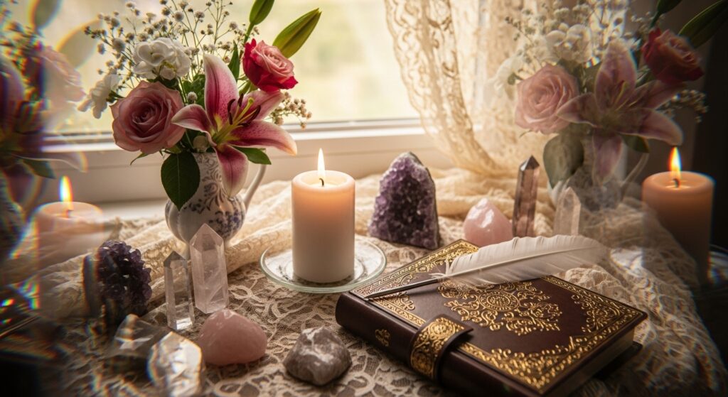 Este tipo de altar funciona como un recordatorio visible de tu práctica espiritual. Cada elemento colocado allí actúa como un lenguaje simbólico que habla a tu mente profunda: las velas representan la luz de la conciencia, las flores evocan la vida y la renovación, los cristales canalizan intención, y las imágenes de diosas o símbolos femeninos activan arquetipos internos. Con el tiempo, ese espacio comienza a acumular significado emocional y espiritual, convirtiéndose en un refugio energético personal.