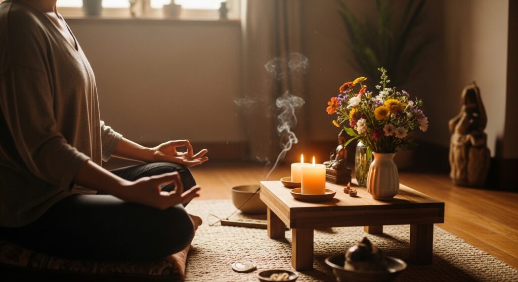 Durante el día, el altar puede funcionar como un lugar simbólico al que regresar cuando sientes estrés, dudas o sobrecarga mental.