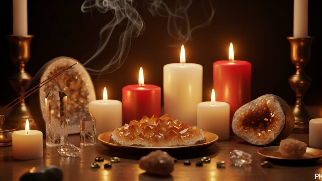 Coloca las velas formando un pequeño altar y sitúa los cristales alrededor. Respira profundamente tres veces y conéctate con la energía de las Diosas.